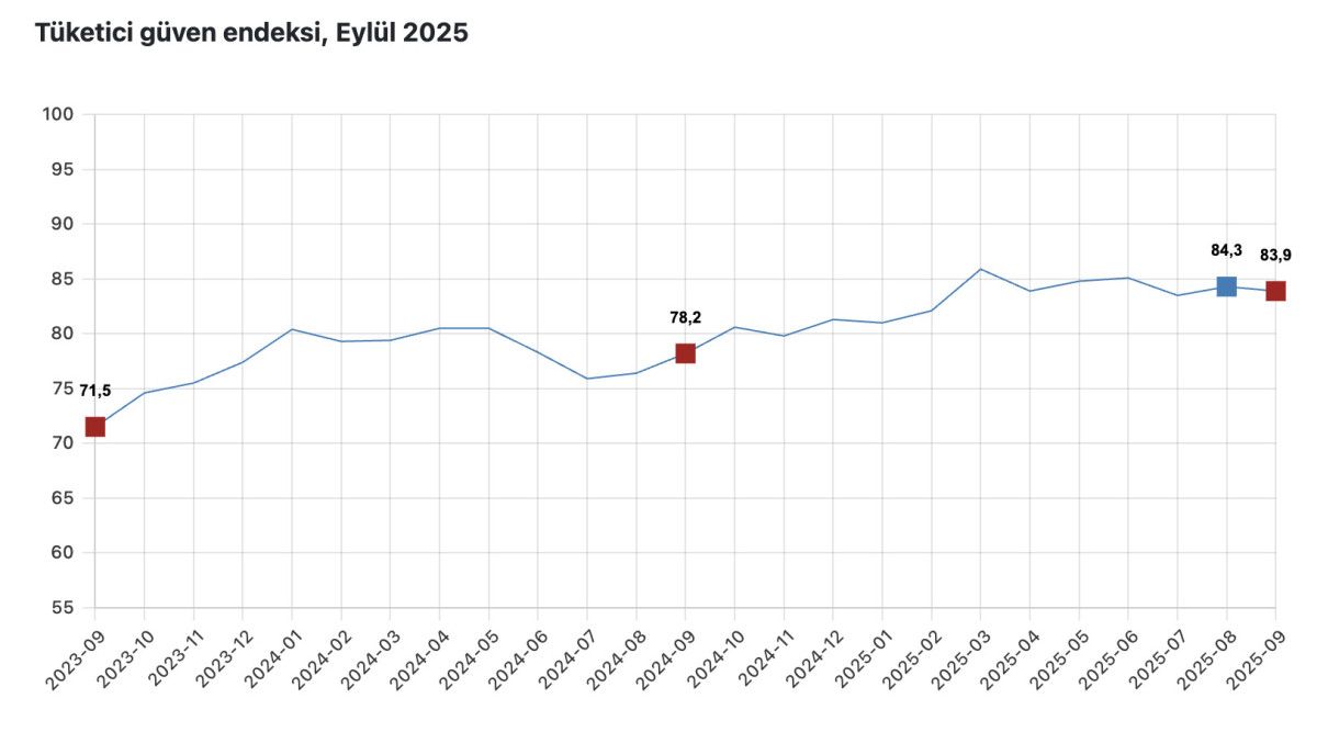 - Tüketici güven endeksi eylül ayında yüzde 0,4 azalarak 83,9 oldu.