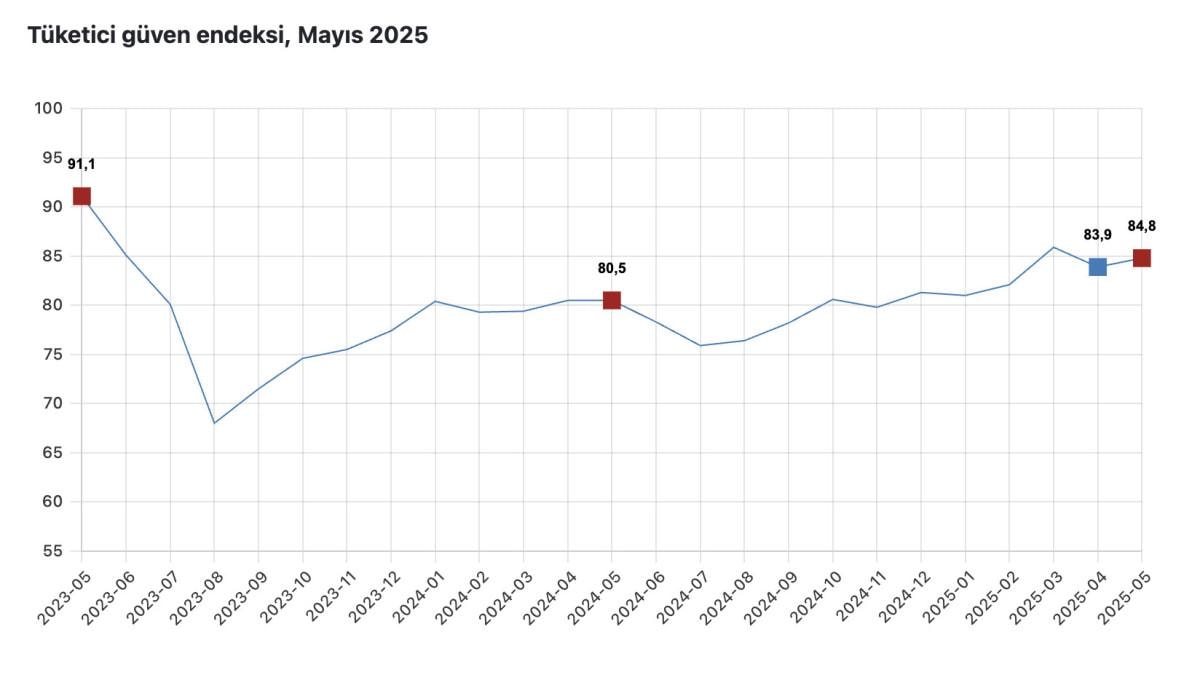 TÜİK ve Türkiye Cumhuriyet Merkez Bankası (TCMB) iş birliği ile yürütülen tüketici eğilim anketi sonuçlarından hesaplanan tüketici güven endeksi, nisan ayında 83,9 iken mayıs ayında yüzde 1,1 oranında artarak 84,8 oldu.