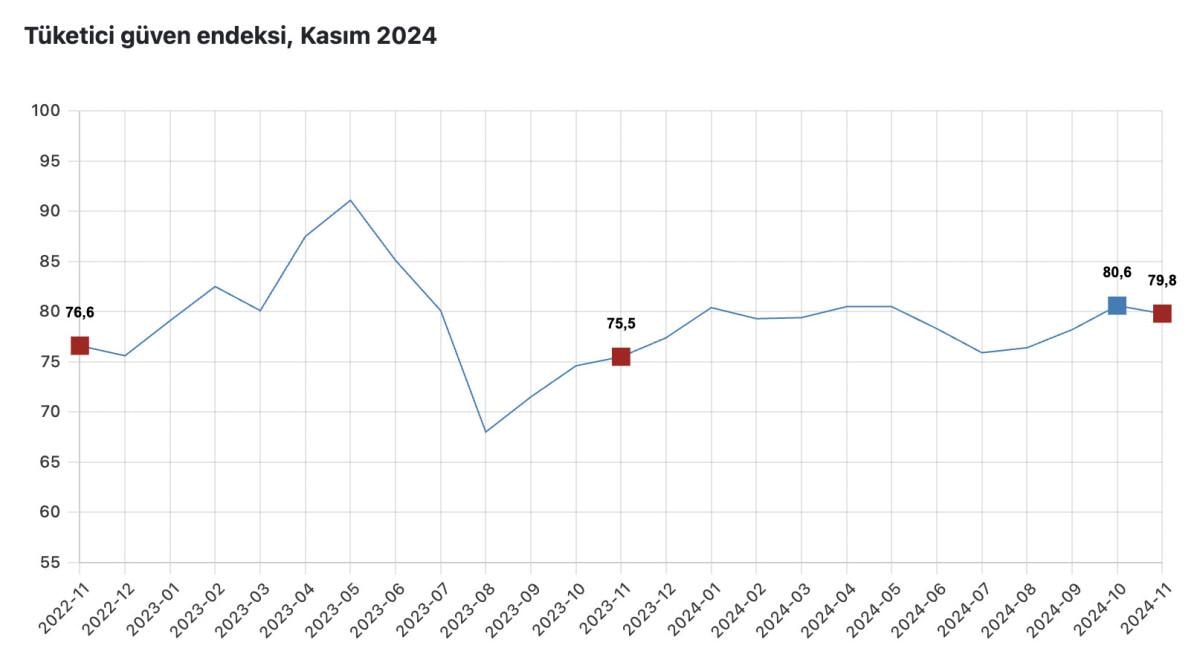 TÜİK ve Türkiye Cumhuriyet Merkez Bankası (TCMB) iş birliği ile yürütülen tüketici eğilim anketi sonuçlarından hesaplanan tüketici güven endeksi, ekim ayında 80,6 iken kasım ayında yüzde 1 oranında azalarak 79,8 oldu.