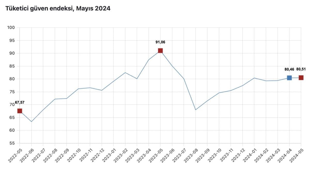 TÜİK ve Türkiye Cumhuriyet Merkez Bankası (TCMB) iş birliği ile yürütülen tüketici eğilim anketi sonuçlarından hesaplanan tüketici güven endeksi, nisan ayında 80,46 iken mayıs ayında yüzde 0,1 oranında artarak 80,51 oldu.
