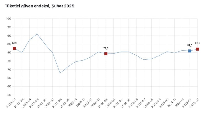 TÜİK ve Türkiye Cumhuriyet Merkez Bankası (TCMB) iş birliği ile yürütülen tüketici eğilim anketi sonuçlarından hesaplanan tüketici güven endeksi, ocak ayında 81 iken şubat ayında yüzde 1,4 oranında artarak 82,1 oldu.