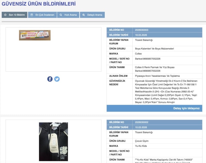 Platformda son yapılan güvensiz ürün bildirimlerinde, özellikle çocuklara yönelik bazı ürünlerin yer alması dikkat çekiyor. Güvensiz Ürün Bilgi Sistemi'ndeki son 10 bildirimden 6'sını, çocukların kullandığı boya kalemleri ve boya malzemeleri, çocuk giyim, pelüş oyuncaklar ve parmak boyalar kategorisinde yer alan ürünler oluşturuyor. Güvensiz ürün bildirimlerinde, çocuk ürün gruplarının adından ise mobilya ve lavabo açıcı geliyor.