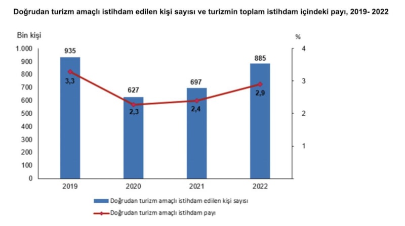 Turizm sektörlerinde doğrudan turizm amaçlı istihdam edilen kişi sayısı 2022 yılında bir önceki yıla göre yüzde 27 artarak 885 bin kişi oldu. 2022 yılında turizm sektöründeki istihdamın toplam istihdam içindeki payı yüzde 2,9'dur.