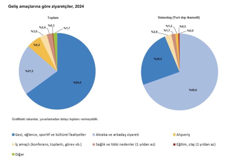 Yıllık olarak ziyaretçilerin geliş amaçlarında birinci sırada yüzde 64,9 ile "gezi, eğlence, sportif ve kültürel faaliyetler" yer alırken yurt dışı ikametli vatandaşlar ülkemize yüzde 69,6 ile en çok "akraba ve arkadaş ziyareti" amacıyla geldi.
