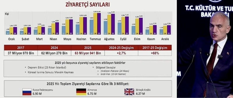 Ersoy, geçen yıl Türkiye'ye 63 milyon 941 bin ziyaretçi geldiğini ve Türkiye'den çıkış yapan ziyaretçi sayısının 2025 yılında, bir önceki yıla göre yüzde 2,7 arttığı açıkladı.