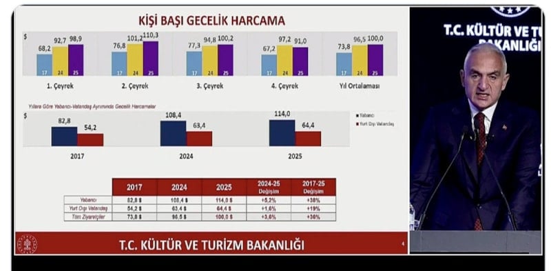 Yıllık olarak geceleme yapanların gecelik ortalama harcaması 100 dolar, yurt dışında ikamet eden vatandaşların gecelik ortalama harcaması ise 64 dolar oldu.