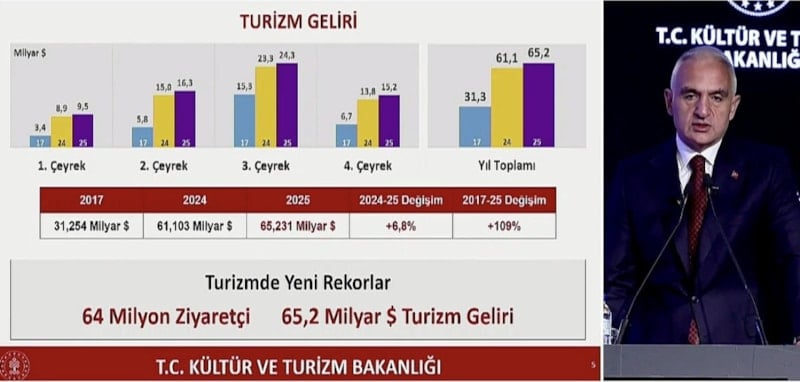 Cumhuriyet tarihinde bir ilk olarak Türkiye 65,2 milyar dolarlık turizm geliriyle tüm zamanların en yüksek seviyesine ulaştı. 2025 yılında 63,9 milyon ziyaretçi ağırlanırken kişi başı gecelik ortalama harcama da 100 dolar seviyesine yükseldi. Turizm geliri ise 2017 yılına kıyasla yüzde 109 artış gösterirken ziyaretçi sayısındaki artış da yüzde 68 olarak kaydedildi.