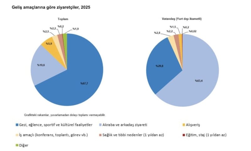 Ülkemizden çıkış yapan ziyaretçi sayısı 2025 yılında bir önceki yıla göre yüzde 2,7 artarak 63 milyon 941 bin kişi oldu. Bunların yüzde 17,5'ini 11 milyon 175 bin 394 kişi ile yurt dışında ikamet eden vatandaşlar oluşturdu.