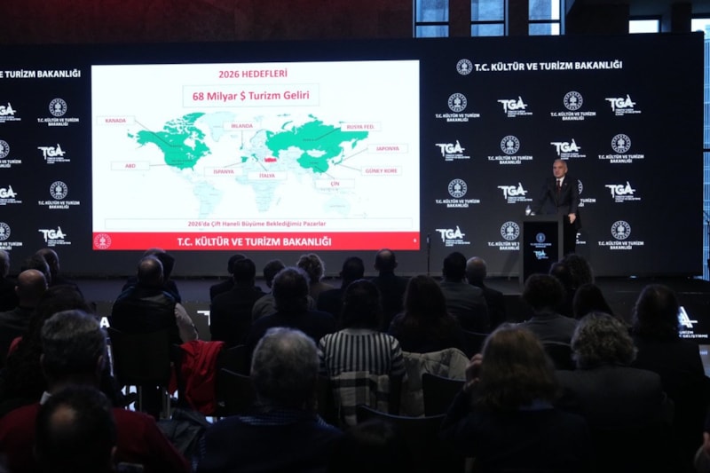 Kültür ve Turizm Bakanı Mehmet Nuri Ersoy, toplantıda 2025 yılı son çeyrek turizm verilerini aktararak Türkiye'nin, dünyada en fazla ilgi çeken ülke olarak 4. sıraya yerleştiğini aktardı.
