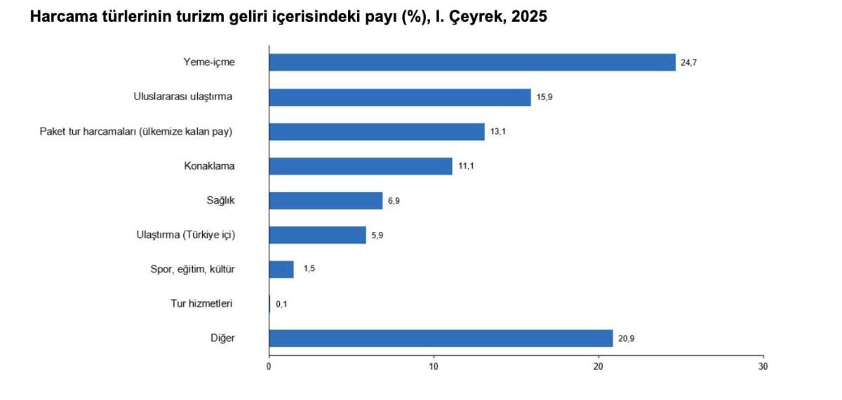 Bu çeyrekte turizm geliri içerisindeki yeme içme harcamalarının payı yüzde 24,7, uluslararası ulaştırma harcamalarının payı yüzde 15,9, paket tur harcamalarının payı ise yüzde 13,1 oldu. Bir önceki yılın aynı dönemine göre paket tur harcamaları yüzde 20,8, yeme içme harcamaları yüzde15,7 ve ulaştırma (Türkiye içi) harcamaları yüzde 8,9 arttı.