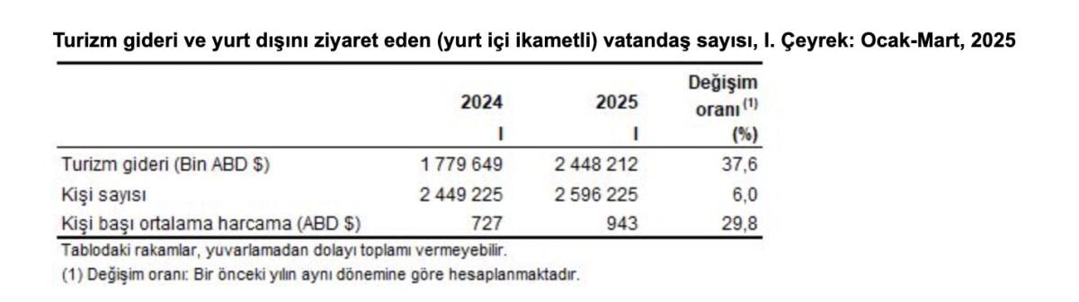 Bu çeyrekte yurt dışını ziyaret eden vatandaş sayısı, bir önceki yılın aynı çeyreğine göre yüzde 6 artarak 2 milyon 596 bin 225 kişi oldu. Bunların kişi başı ortalama harcaması 943 dolar olarak gerçekleşti.