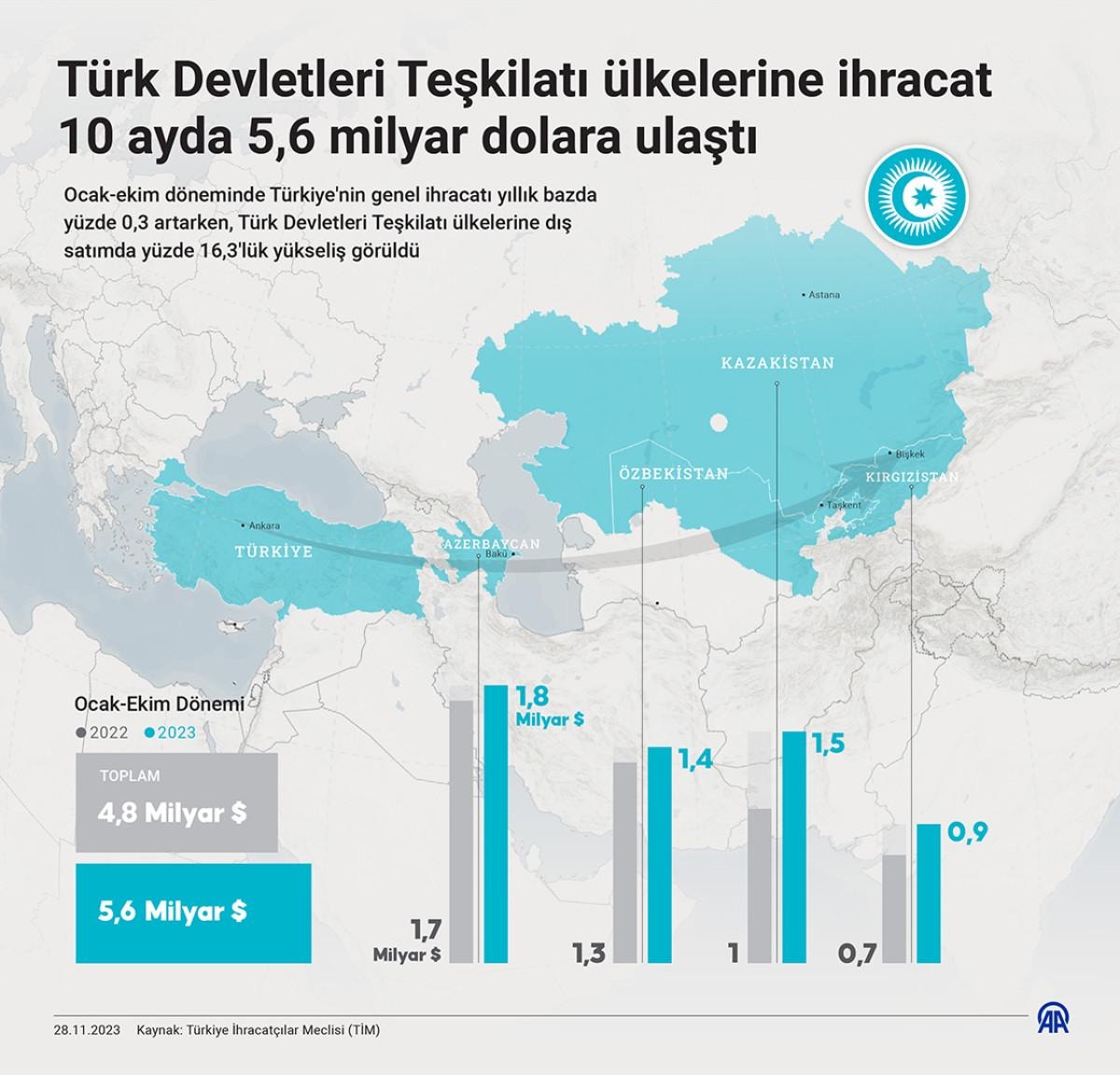 Türkiye'nin, Türk Devletleri Teşkilatı ülkelerine ihracatı yılın 10 ayında 5,6 milyar dolara yükselirken, en fazla ihracat 1,8 milyar dolarla Azerbaycan'a gerçekleşti.
