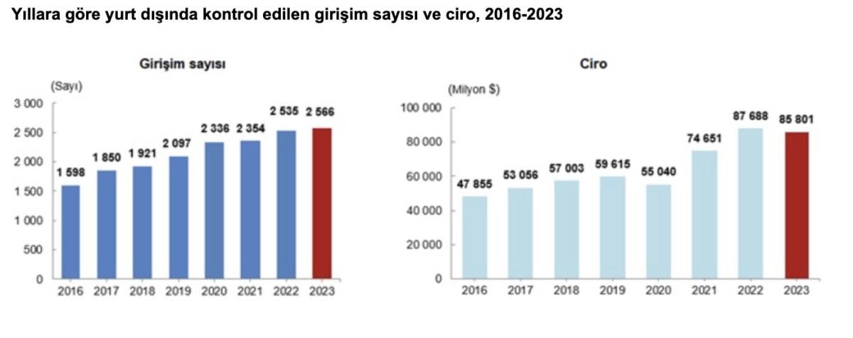 Yurt dışında kontrol edilen girişim istatistiklerine göre, Türkiye'de yerleşik girişimlerin yurt dışında kontrol ettiği girişim sayısı 2022 yılında 2 bin 535 ve 2023 yılında 2 bin 566 oldu.