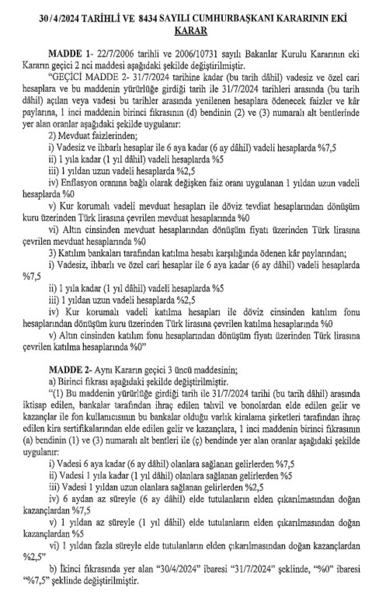 Mevduata uygulanan yeni stopaj oranları, 31 Temmuz 2024 tarihine kadar geçerli olacak.