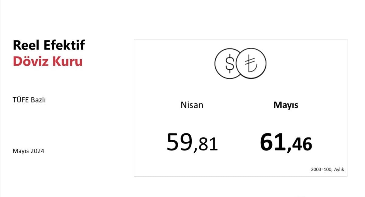 Reel efektif döviz kuru endeksi, Mayıs 2024'te TÜFE bazında 1,65 puan artarak 61,46'ye çıkarken, Eylül 2021'den bu yana Türk Lirası reel anlamda en değerli seviyesine yükseldi.