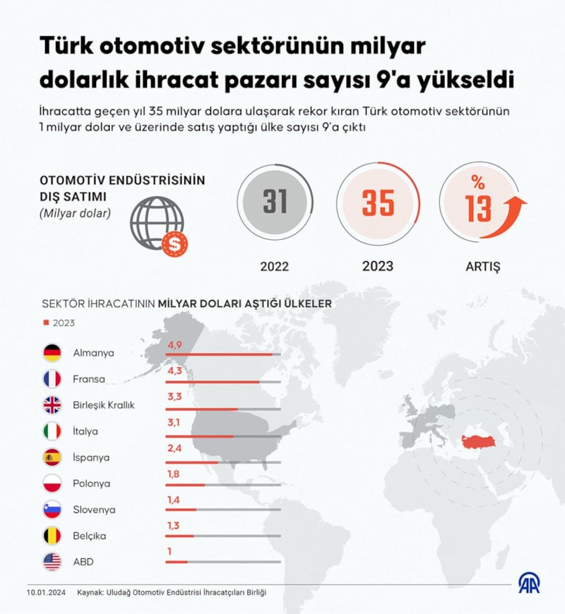 İhracatta geçen yıl 35 milyar dolara ulaşarak rekor kıran Türk otomotiv sektörünün 1 milyar dolar ve üzerinde satış yaptığı 9 ülke arasında Almanya, Fransa ve Birleşik Krallık öne çıktı.