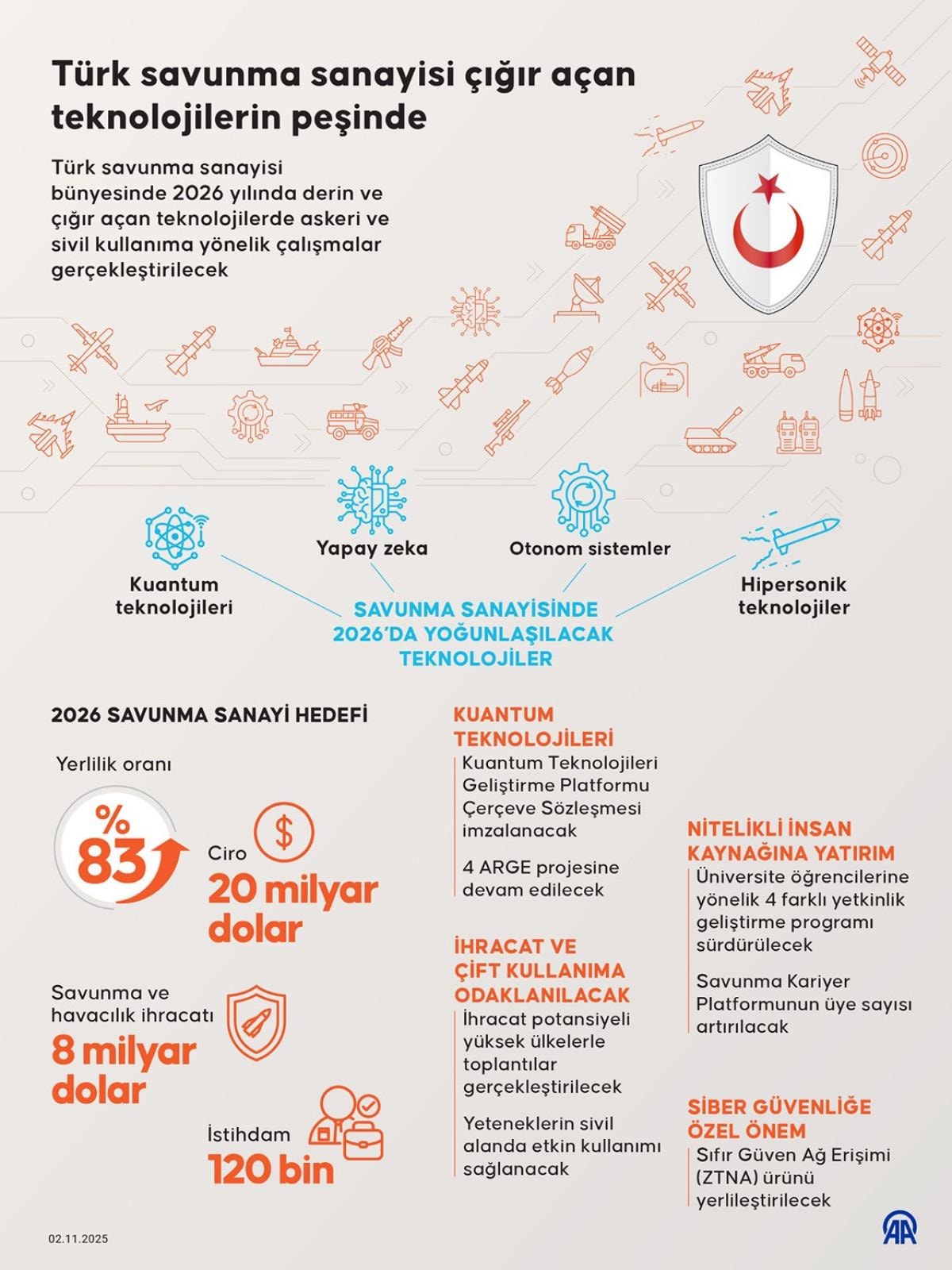 - 2026 Yılı Cumhurbaşkanlığı Yıllık Programı doğrultusunda, Türk savunma sanayiinde kuantum teknolojileri, yapay zeka ve otonom sistemler gibi çığır açıcı teknolojilere odaklanılacak.