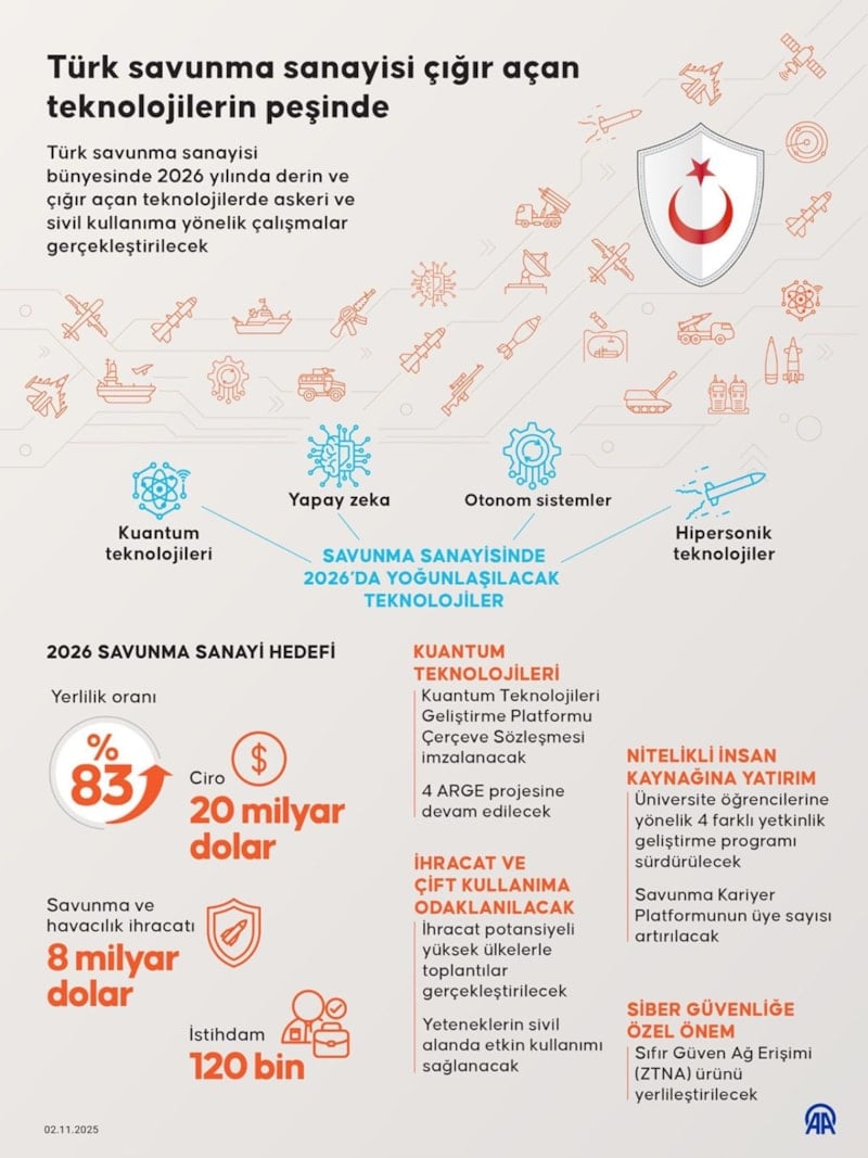 2026 Yılı Cumhurbaşkanlığı Yıllık Programı doğrultusunda, kuantum teknolojileri, yapay zeka, otonom sistemler, hipersonik teknolojiler gibi derin ve çığır açan teknolojilerde askeri ve sivil kullanıma yönelik çalışmalar gerçekleştirilecek.