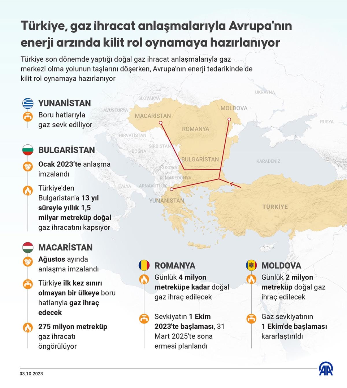 Yılın üçüncü gaz ihracat anlaşmasını Romanya ile yapan Türkiye, günlük 4 milyon metreküpe kadar doğalgazı Romanya'ya ihraç edecek. Sevkiyatın 1 Ekim'de başlaması, 31 Mart 2025'te sona ermesi planlandı.