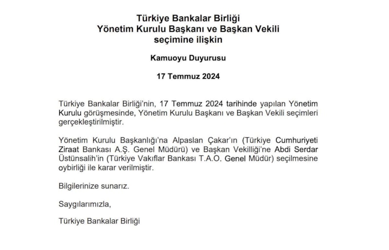 TBB'den yapılan açıklamaya göre, bugün yapılan yönetim kurulu toplantısında, başkan vekilliğine ise Vakıflar Bankası Genel Müdürü Abdi Serdar Üstünsalih getirildi.