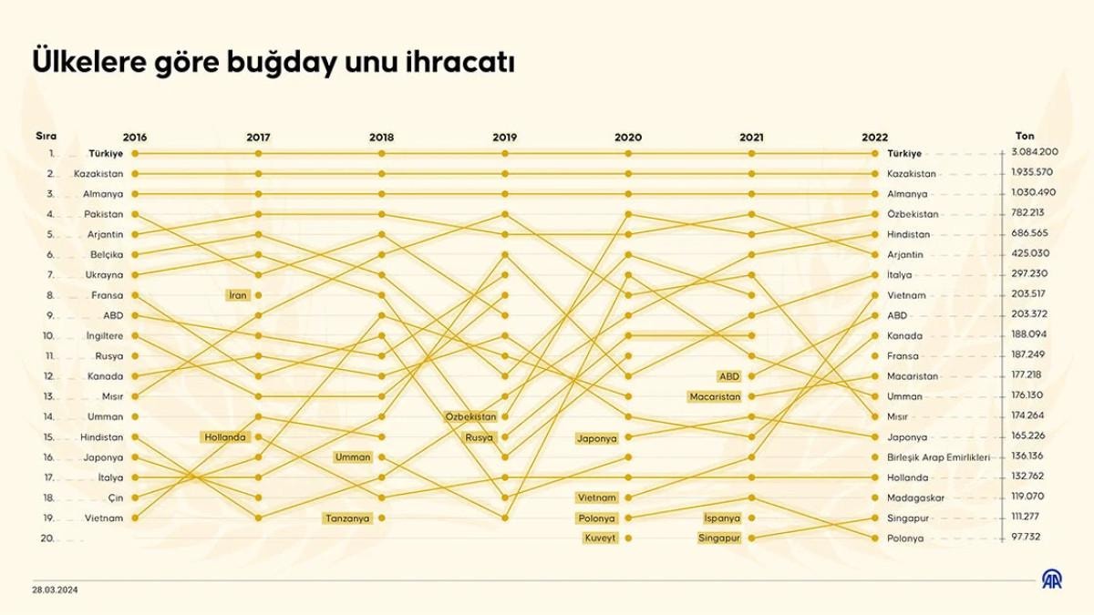 Öte yandan Türkiye, Dünya Bankası'nın son verilerine göre, buğday unu ihracatında da 2013-2022 döneminde aralıksız ilk sırada bulundu.