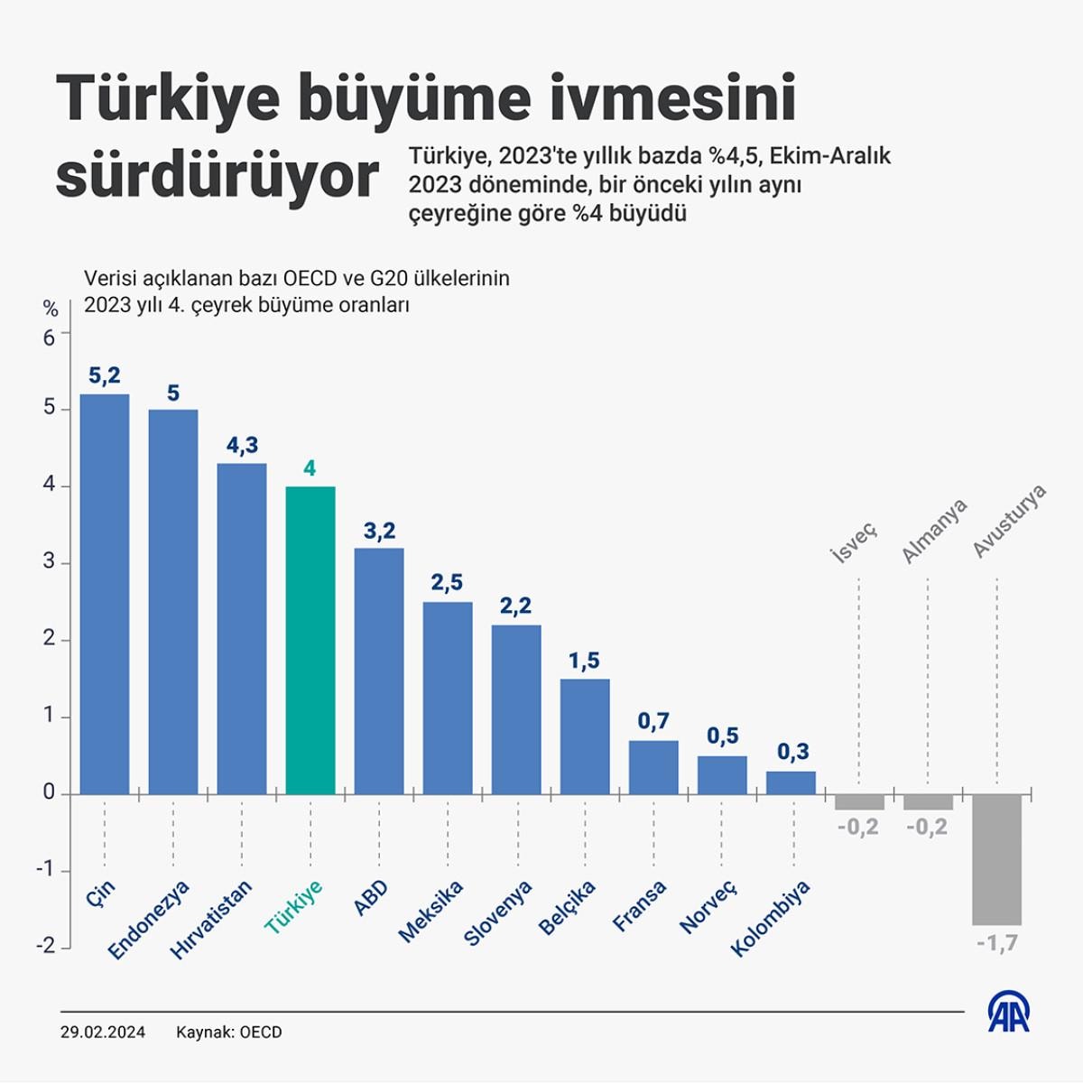 Türkiye, 2023'ün son çeyreğinde, yıllık bazda, bugüne kadar ekonomik büyüme verisi açıklanan OECD'ye üye ülkeler arasında en hızlı büyüyen ikinci ekonomi ünvanına sahip oldu.