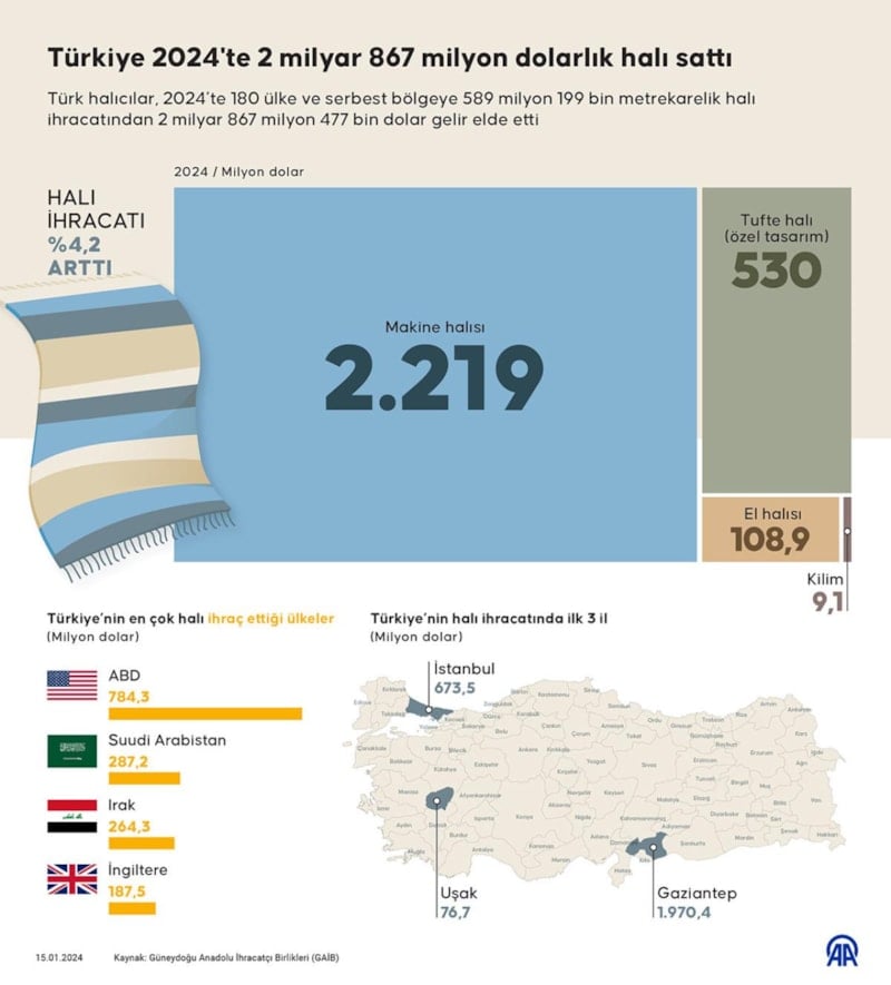 GAİB verilerine göre, Türkiye'deki halı üreticileri 2024 yılında, 180 ülke ve serbest bölgeye 589 milyon 199 bin metrekare halı sattı.