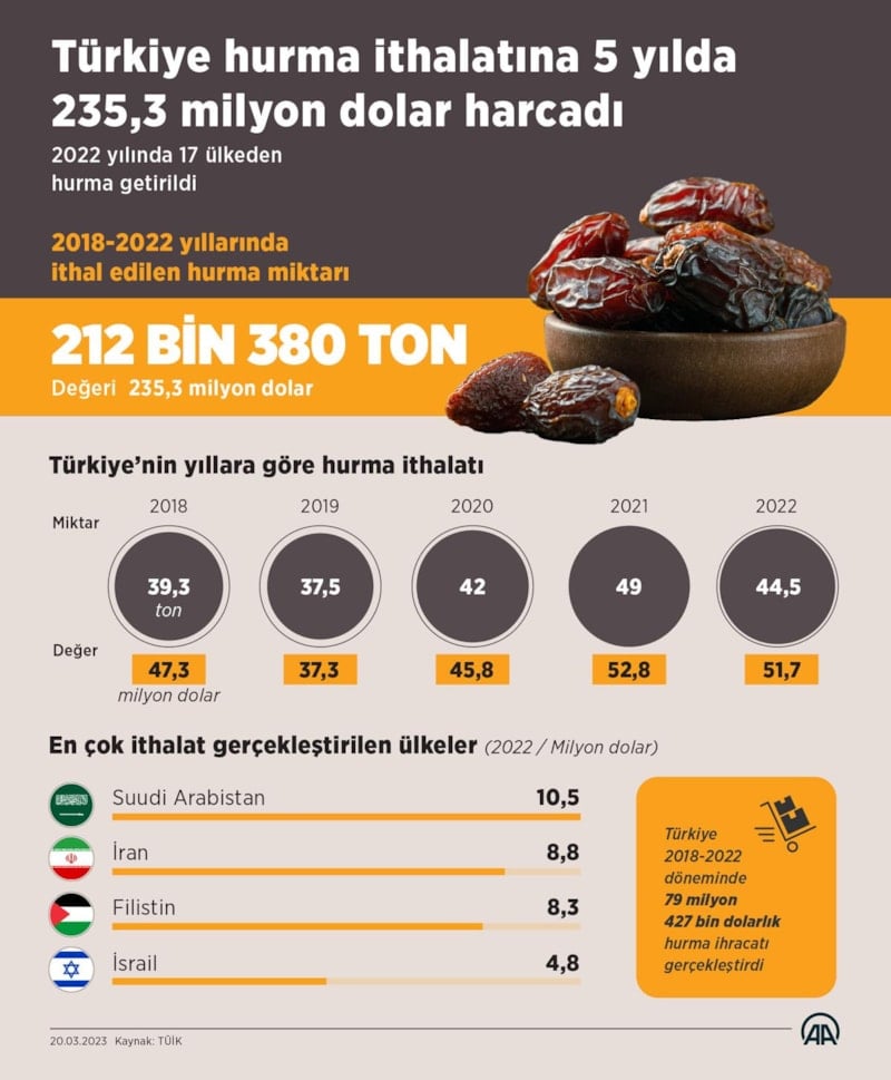 Türkiye İstatistik Kurumu (TÜİK) verilerinden derlediği bilgiye göre, 2018'de 39 bin 310 ton, 2019'da 37 bin 500 ton, 2020'de 42 bin 43 ton, 2021'de 49 bin 41 ton ve geçen yıl 44 bin 486 ton hurma ithal edildi.