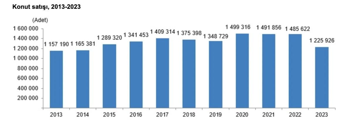 Konut satışları 2023 yılında, bir önceki yıla göre yüzde 17,5 azalarak 1 milyon 225 bin 926 olarak gerçekleşti.