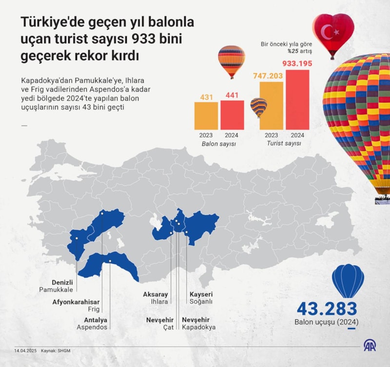 Nevşehir-Kapadokya, Denizli-Pamukkale, Kayseri-Soğanlı, Nevşehir-Çat, Antalya-Aspendos ile Aksaray-Ihlara ve Afyonkarahisar-Frig vadilerinde geçen yıl 43 bin 283 sıcak hava balonu uçuşu yapıldı.