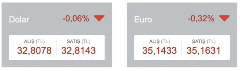 Buna göre dolar yüzde 0,06 düşüşle 32,8143 lira, euro yüzde 0,32 düşerek 35,1631 liraya geriledi.