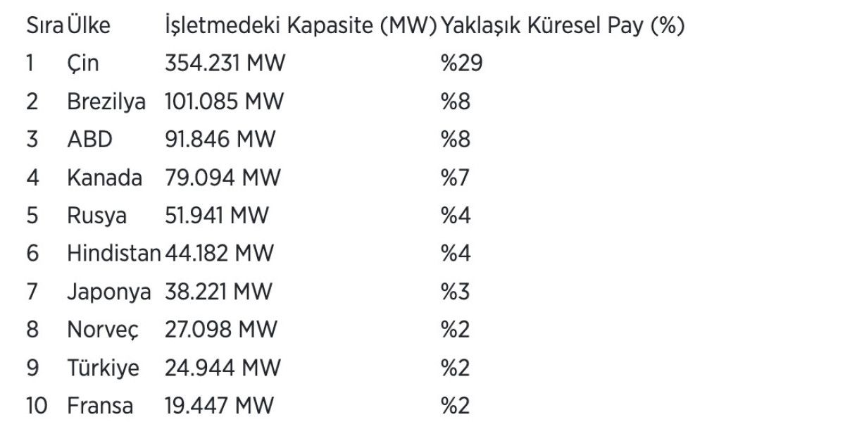 Kanada 79 bin 94 megavat ve Rusya 51 bin 941 megavatla sırasıyla yaklaşık yüzde 7 ve yüzde 4'lük paylarıyla ilk beşi tamamlıyor. Listenin devamında Hindistan, Japonya ve Norveç gibi ülkeler yer alıyor.