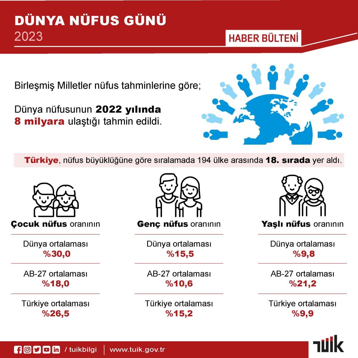 Türkiye, nüfus büyüklüğüne göre 194 ülke arasında 18. sırada yer alırken, dünya toplam nüfusunun yüzde 1,1'ini oluşturdu.