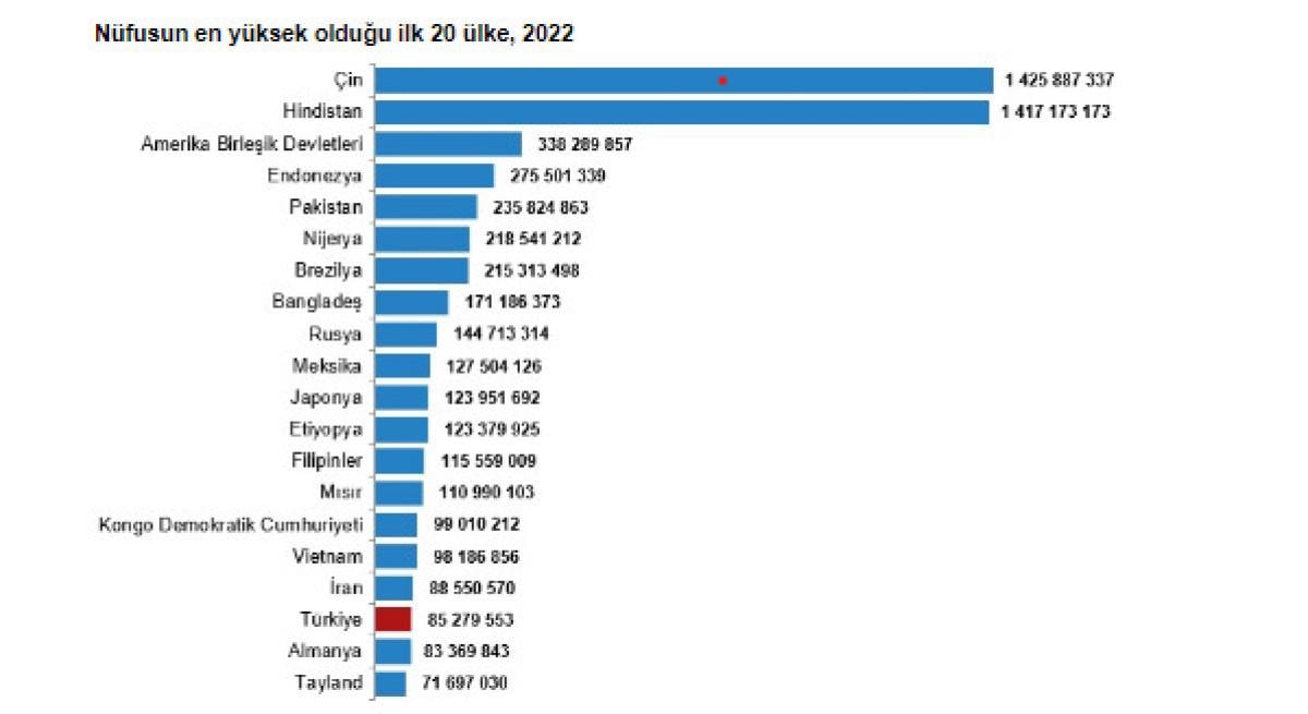 Türkiye, 85 milyon 279 bin 553 kişi nüfusu ile nüfus büyüklüğüne göre 194 ülke arasında 18. sırada yer alırken, dünya toplam nüfusunun yüzde 1,1'ini oluşturdu.