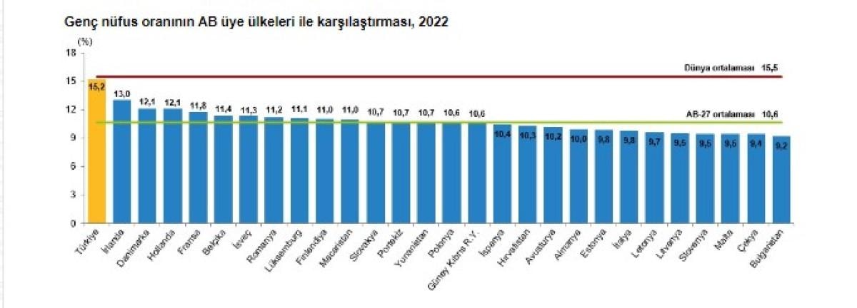Genç nüfus oranı dünya ortalaması, 2022 yılında yüzde 15,5 oldu. Türkiye'nin genç nüfus oranın yüzde 15,2 ile dünya genç nüfus ortalamasının hemen altında olduğu görüldü.