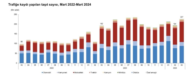 Mart ayı sonu itibarıyla trafiğe kayıtlı taşıtların yüzde 52,8'ini otomobil, yüzde 18,1'ini motosiklet, üzde 15,5'ini kamyonet, yüzde 7,5'ini traktör, yüzde 3,3'ünü kamyon, yüzde 1,7'sini minibüs, yüzde 0,7'sini otobüs ve yüzde 0,4'ünü özel amaçlı taşıtlar oluşturdu.
