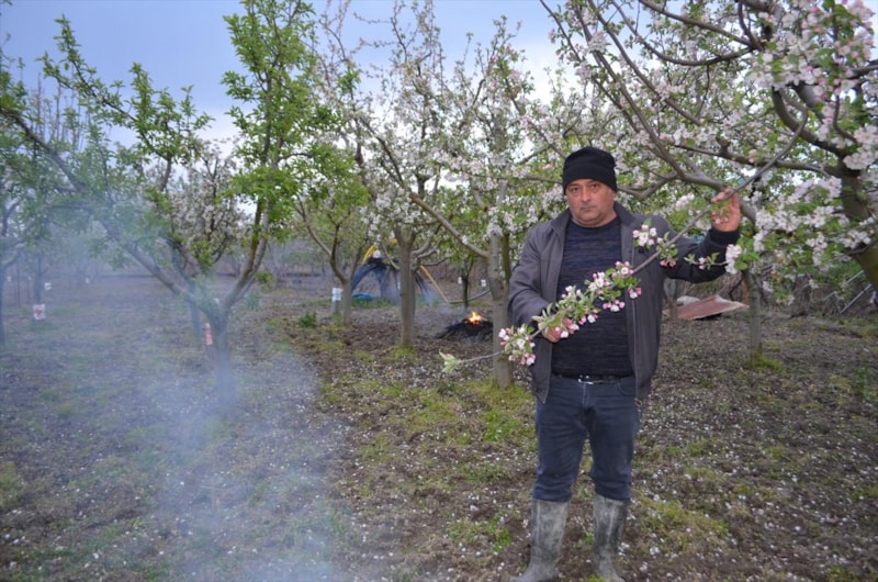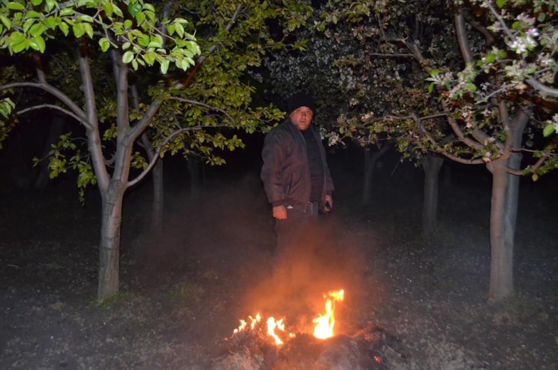 İlçede meyve üretimi yapan Selahattin Sularoğlu, 180 elma, ayva, armut, incir, şeftali ve erik ağacının bulunduğu 3 bin 500 dekarlık bahçesinde ateş yaktı. Sularoğlu, bahçelerde dumanın yayılması için saman balyası ve odun yaktıklarını söyledi.