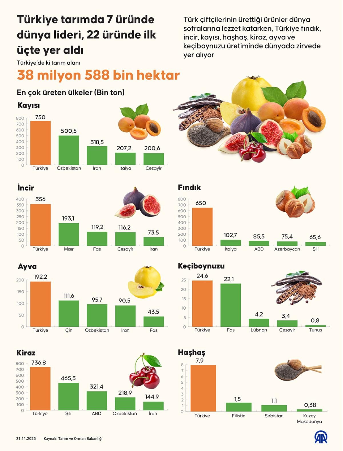 Türkiye, fındık, incir, kayısı, haşhaş, kiraz, ayva ve keçiboynuzu yıllık üretiminde ise dünyada zirvede yer alıyor.