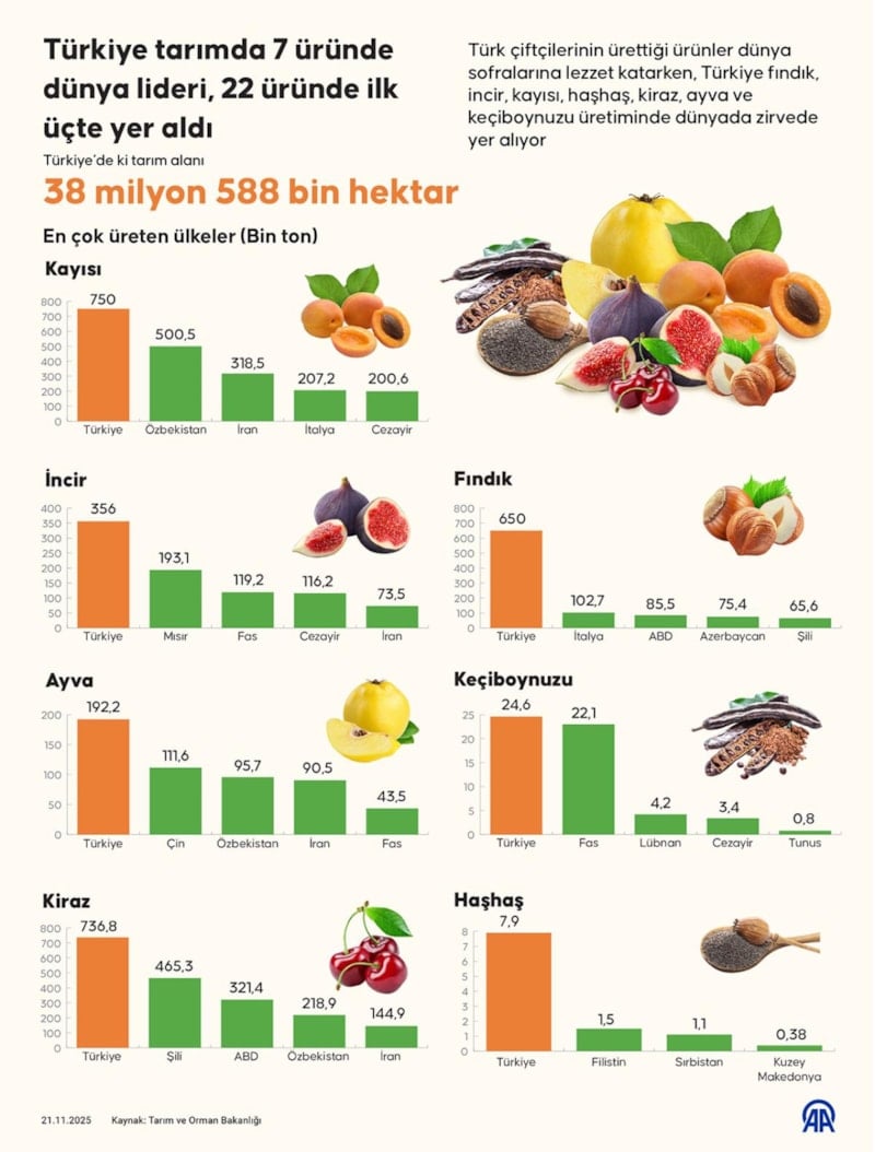 Türkiye, 22 ürünle ilk üçte yer alırken fındık, incir, kayısı, haşhaş, kiraz, ayva ve keçiboynuzu üretimindeyse dünyada söz sahibi ülke konumunda bulunuyor.