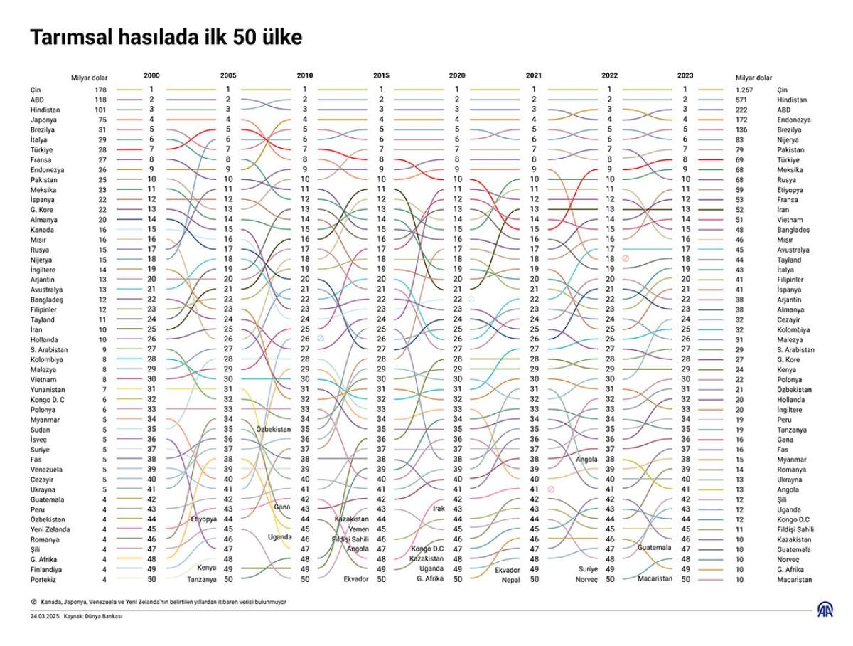 Birleşmiş Milletler Gıda ve Tarım Örgütü (FAO) ile Dünya Bankası, ülkelerin tarımsal hasıla verilerini güncel olarak 2023 yılına kadar hesapladı. Buna göre, Türkiye tarımsal hasılada dünyanın önde gelen ülkelerini izliyor.