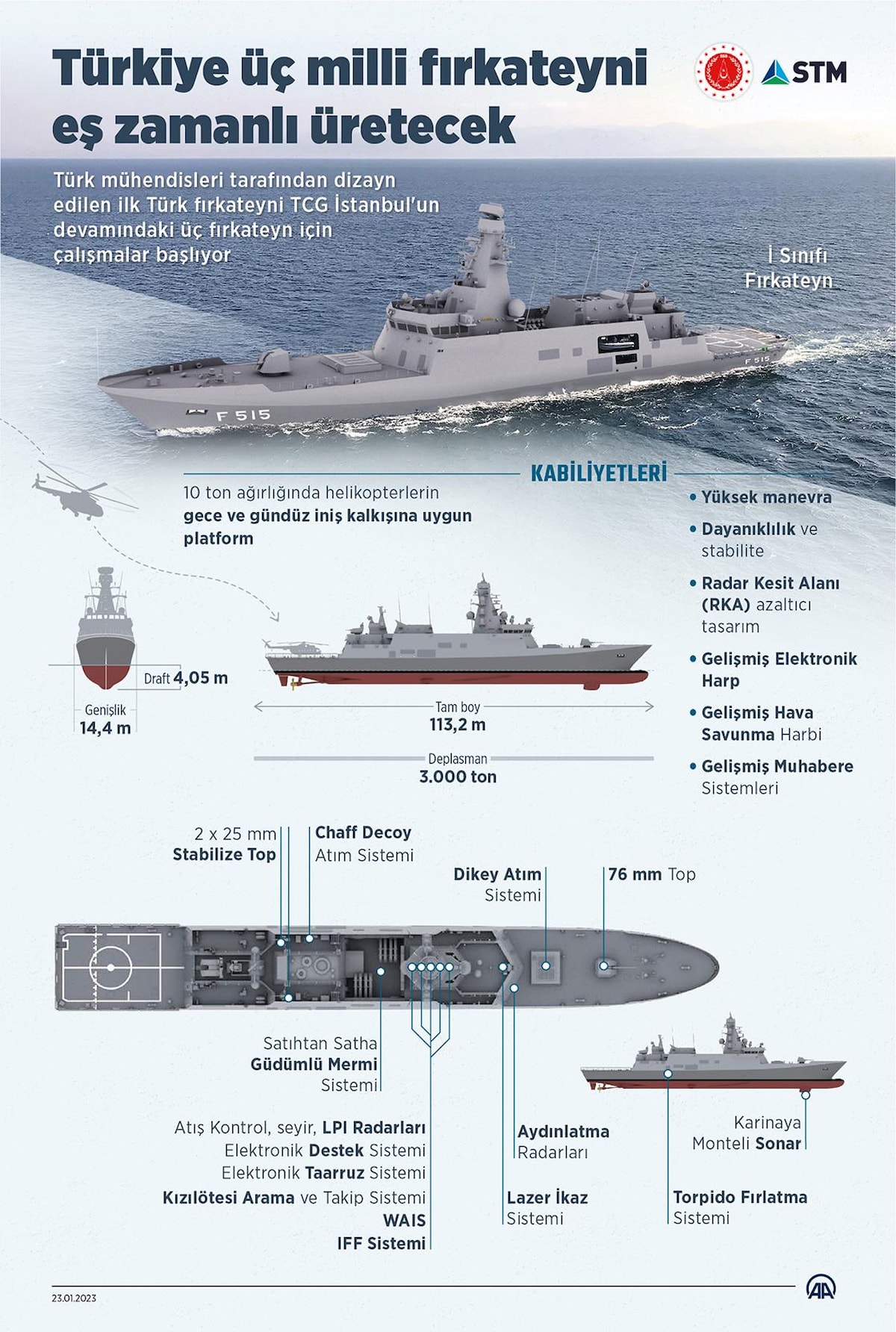 "Gemilerin inşasının, sürdürülebilir bir askeri gemi inşa sanayisi oluşturabilmek için özel tersanelerin üretici sıfatıyla yer aldığı bir modelle yürütülmesinin uygun olduğu değerlendirildi. Bununla birlikte, bu modelle üç gemi için teslim süresinde avantaj sağlanacak, askeri gemi inşasında özel sektör tersanelerinde bilgi ve tecrübe birikimi tutulacak ve pekiştirilecek, sektörün yetenek bazlı büyümesi ve sürdürülebilirliği desteklenecek, ihracat potansiyeli yüksek nitelikli bir ürün ortaya konulacak, ölçek ekonomisine katkı sağlanacak. Üç geminin 36 ayda teslimi planlanıyor. İ sınıfı fırkateynlerin ilki TCG İstanbul'da yerlilik oranı yüzde 75 seviyesinde bulunmakta. Bununla birlikte projede 80 civarında, büyük çoğunluğu yerli alt yüklenici görev alıyor. Projede çalışan toplam firma sayısı ise yaklaşık 200."