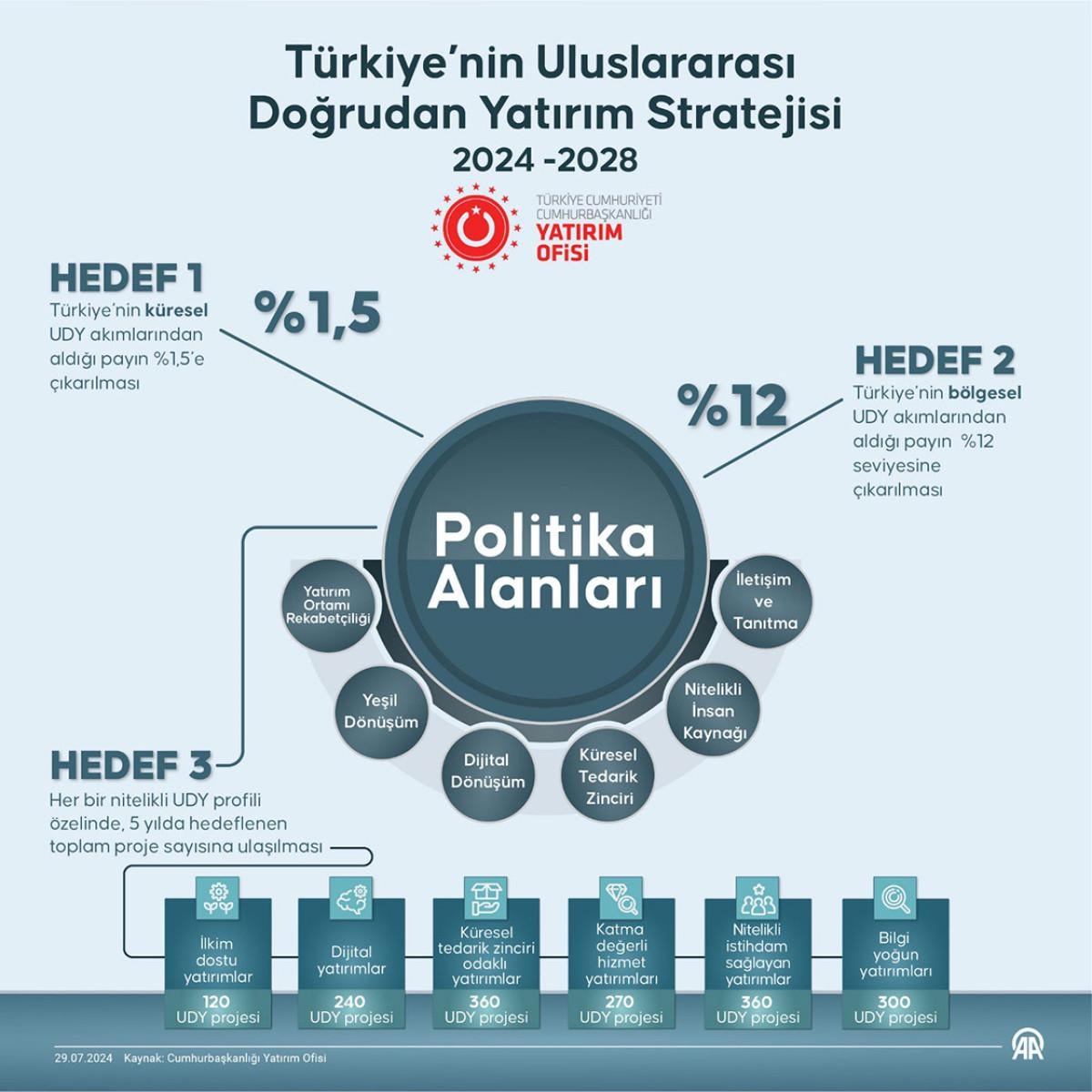 On İkinci Kalkınma Planı (2024-2028) başta olmak üzere tüm ulusal politika belgeleriyle uyumlu bir şekilde ve yatırımcılara sunulan fırsatlar analiz edilerek, Cumhurbaşkanlığı Yatırım Ofisi'nin koordinasyonunda ilgili tüm kamu ve özel sektör kurum ve kuruluşlarının iş birliği ile hazırlanan 'Türkiye Uluslararası Doğrudan Yatırım Stratejisi (2024-2028)' Cumhurbaşkanlığı Yatırım Ofisi'nin resmi internet adresinde (www.invest.gov.tr) yayınlanacaktır.