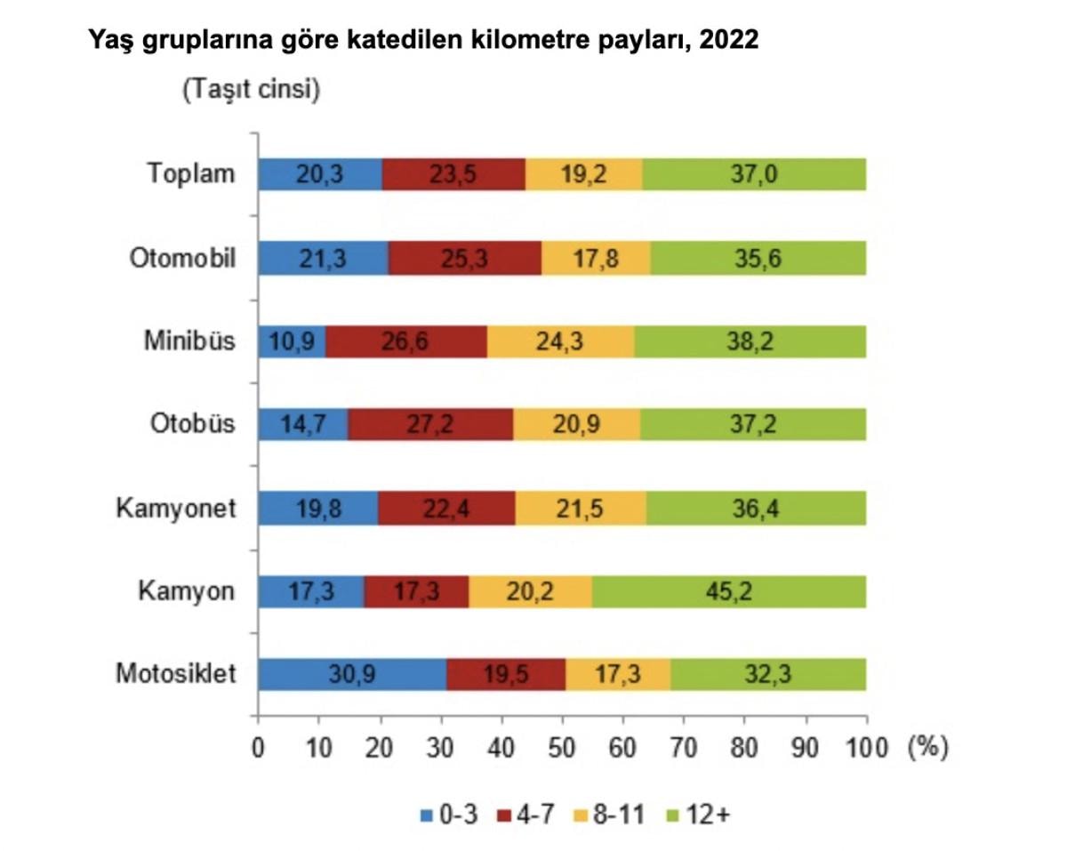Türkiye'de 2022 yılında katedilen toplam mesafe taşıtların yaş gruplarına göre incelendiğinde; en fazla yol yüzde 37,0'lık oranla taşıt filosunun yüzde 48,4'ünü oluşturan 12 yaş ve üstü taşıtlar tarafından yapılırken, bunu sırasıyla yüzde 23,5 ile 4-7 yaş, yüzde 20,3 ile 0-3 yaş ve yüzde 19,2 ile 8-11 yaş grubu taşıtlar takip etti. Bu oran otomobillerde 12 yaş ve üstü otomobiller için yüzde 35,6, 4-7 yaş için yüzde 25,3, 0-3 yaş için yüzde 21,3 ve 8-11 yaş için yüzde 17,8 oldu.