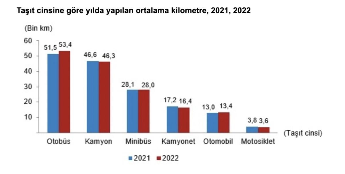 Taşıtların bir yılda yaptıkları ortalama kilometreler incelendiğinde; 2022 yılında sırasıyla otobüslerin 53 bin 409, kamyonların 46 bin 305, minibüslerin 27 bin 951, kamyonetlerin 16 bin 382, otomobillerin 13 bin 415 ve motosikletlerin 3 bin 648 kilometre yaptığı hesaplandı.
