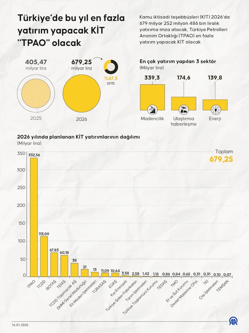 TPAO, 2026'da Türkiye'deki en büyük yatırımcı olacak; geçen yıla göre yüzde 67,5 artışla 679 milyar liralık yatırım yapacak. TCDD ve BOTAŞ gibi kuruluşlara göre ödenek tahsisinde lider konumunda.