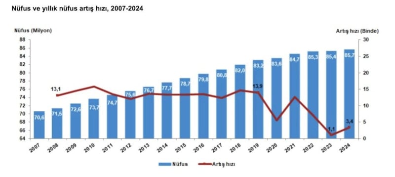 Yıllık nüfus artış hızı 2023 yılında binde 1,1 iken, 2024 yılında binde 3,4 olmuştu. Cumhurbaşkanı Recep Tayyip Erdoğan, dün Azerbaycan dönüşü uçakta gazetecilerin sorularını cevaplarken yaptığı açıklamasıda artış hızının geldiği son noktayı şu sözlerle ifade etti: