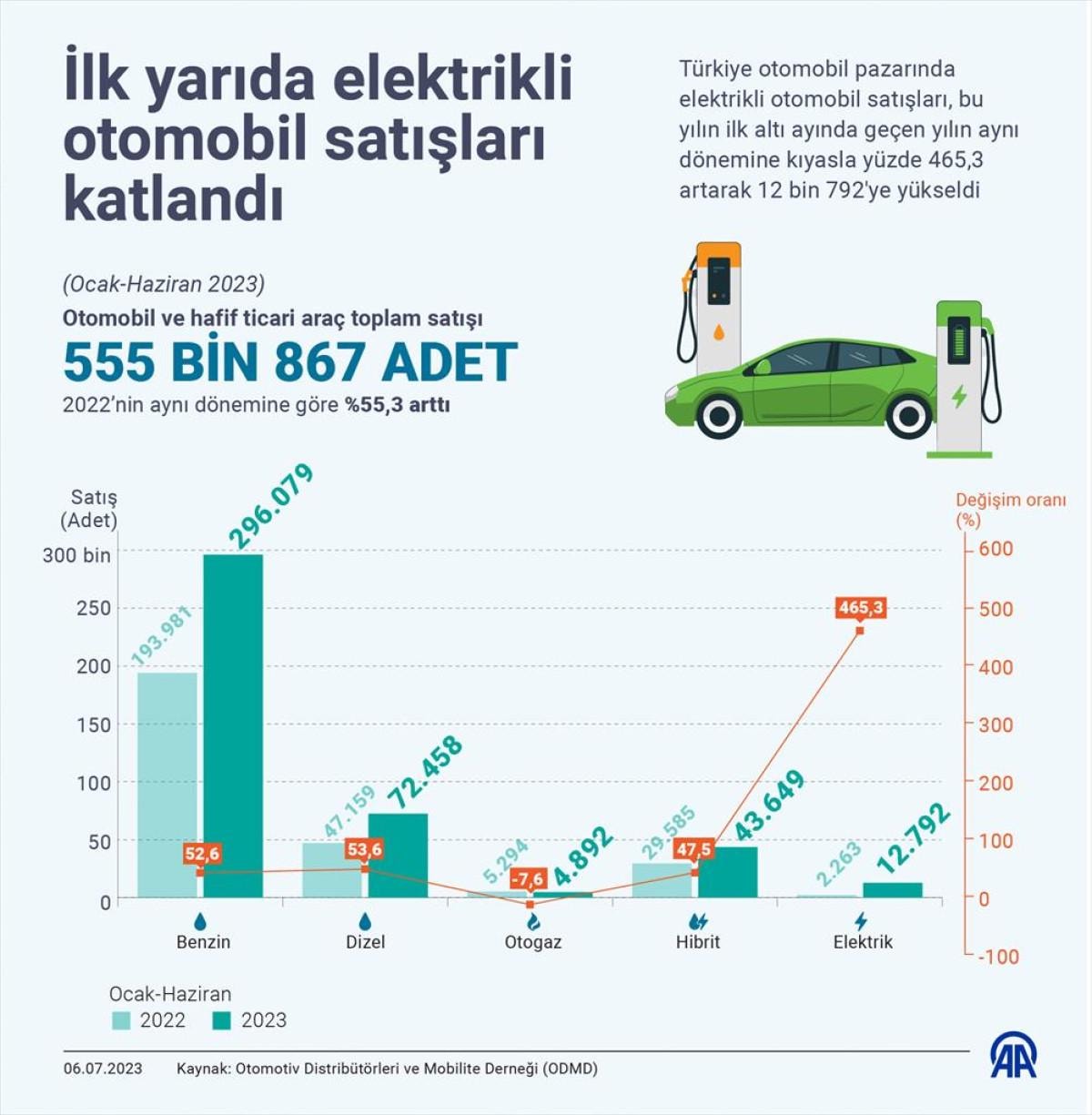 Otomotiv Distribütörleri ve Mobilite Derneği'nin (ODMD) raporuna göre, Türkiye otomobil ve hafif ticari araç toplam satışları, 2023 yılı ocak-haziran döneminde bir önceki yılın aynı dönemine göre yüzde 55,3 artarak 555 bin 867 adet olarak gerçekleşti.