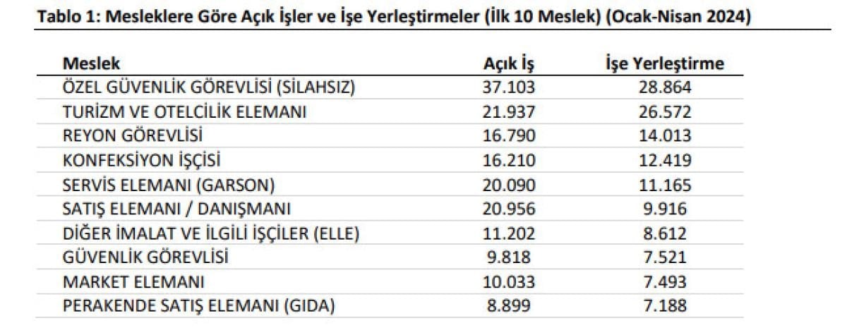 Mesleklere bakıldığında ise sadece nisanda en çok açık iş pozisyonunun özel güvenlik görevlisinde olduğu görülüyor.