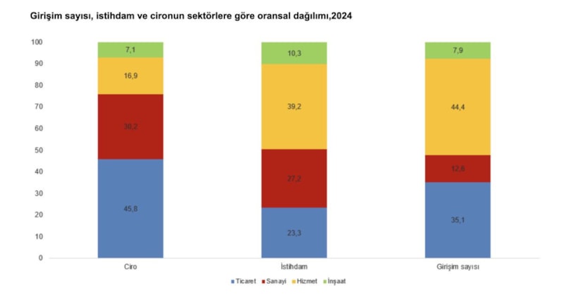 TÜİK verilerine göre, Türkiye'de 2024 yılında faal girişimlerin yüzde 44,4'ü hizmet sektöründe yer alırken, yüzde 35,1'i ticaret sektöründe faaliyet gösterdi.