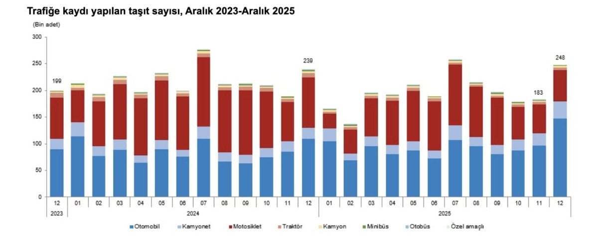 Aralık ayında 248 bin 205 adet taşıtın trafiğe kaydı yapıldı. Aralık ayında trafiğe kaydı yapılan taşıtların yüzde 59,3'ünü otomobil, yüzde 23,6'sını motosiklet, yüzde 12,9'unu kamyonet, yüzde 1,9'unu traktör, yüzde 1,2'sini kamyon, yüzde 0,6'sını minibüs, yüzde 0,3'ünü otobüs ve yüzde 0,2'sini özel amaçlı taşıtlar oluşturdu.